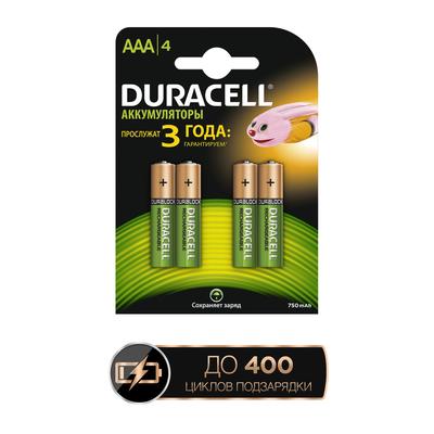 Аккумуляторные батарейки Duracell AAA HR03никель-металлогидридные Ni-Mh, номинальная емкость 750 мАч, максимальное количество подзарядок 1000. Стабильная работа в широком диапазоне температур (от −20 до +50 С). Отсутствует эффект памяти (нет необходимости разряжать аккумуляторы перед зарядом). Количество аккумуляторов в упаковке — 4 штуки.