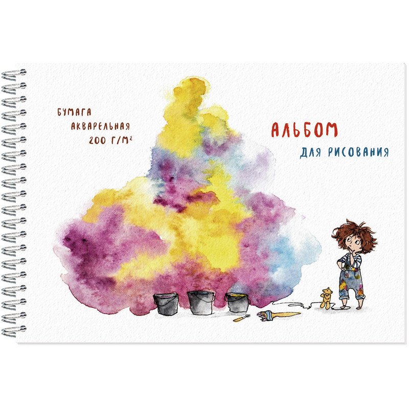 Альбом для акварели с дизайном Маленькая художница А4 20 листов из белой акварельной бумаги плотностью 200 г/кв.м. Имеет жесткую удобную подложку из переплетного картона плотностью 1,25 мм для удобства рисования. Крепление на спирали слева..