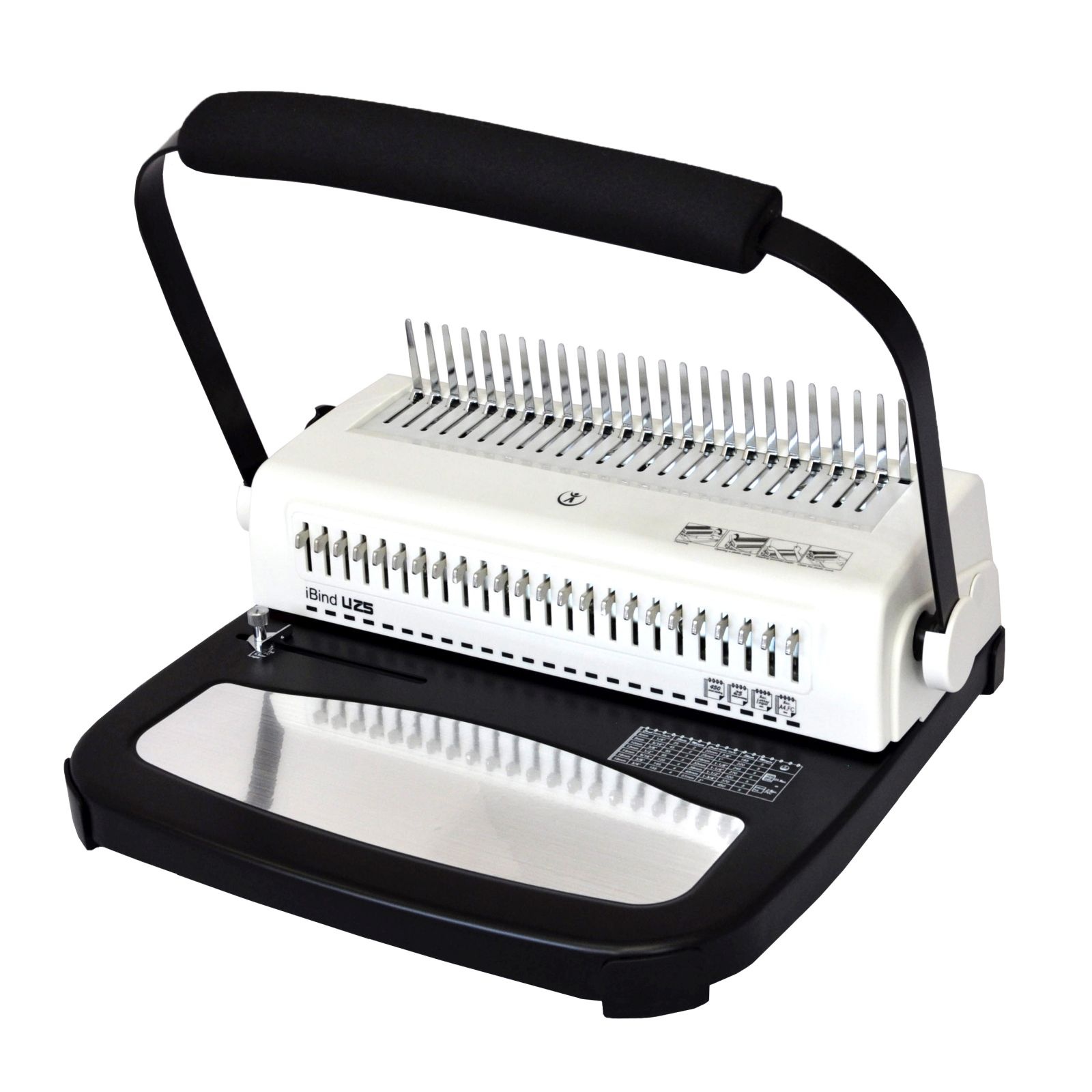 iBind U25 – мощная переплетная машина на пластиковую пружину, пробивающая за раз 25 листов бумаги 80гр/м2 и обладающая 2 ручками для одновременной брошюровки и перфорации, с помощью которой можно переплести до 500 листов бумаги.