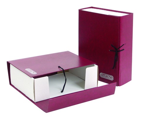 Складной архивный короб Attache формата А4 изготовлен из переплетного картона, снаружи покрыт бумвинилом красного цвета (материал на основе ПВХ). В закрытом виде фиксируется с помощью хлопчатобумажных завязок. Внутренние стойки-упоры выполнены из гофрокартона. Короб вмещает до 950 листов стандартной плотности, ширина корешка — 10 см. Позволяет надежно хранить документы как в вертикальном, так и в горизонтальном положении.