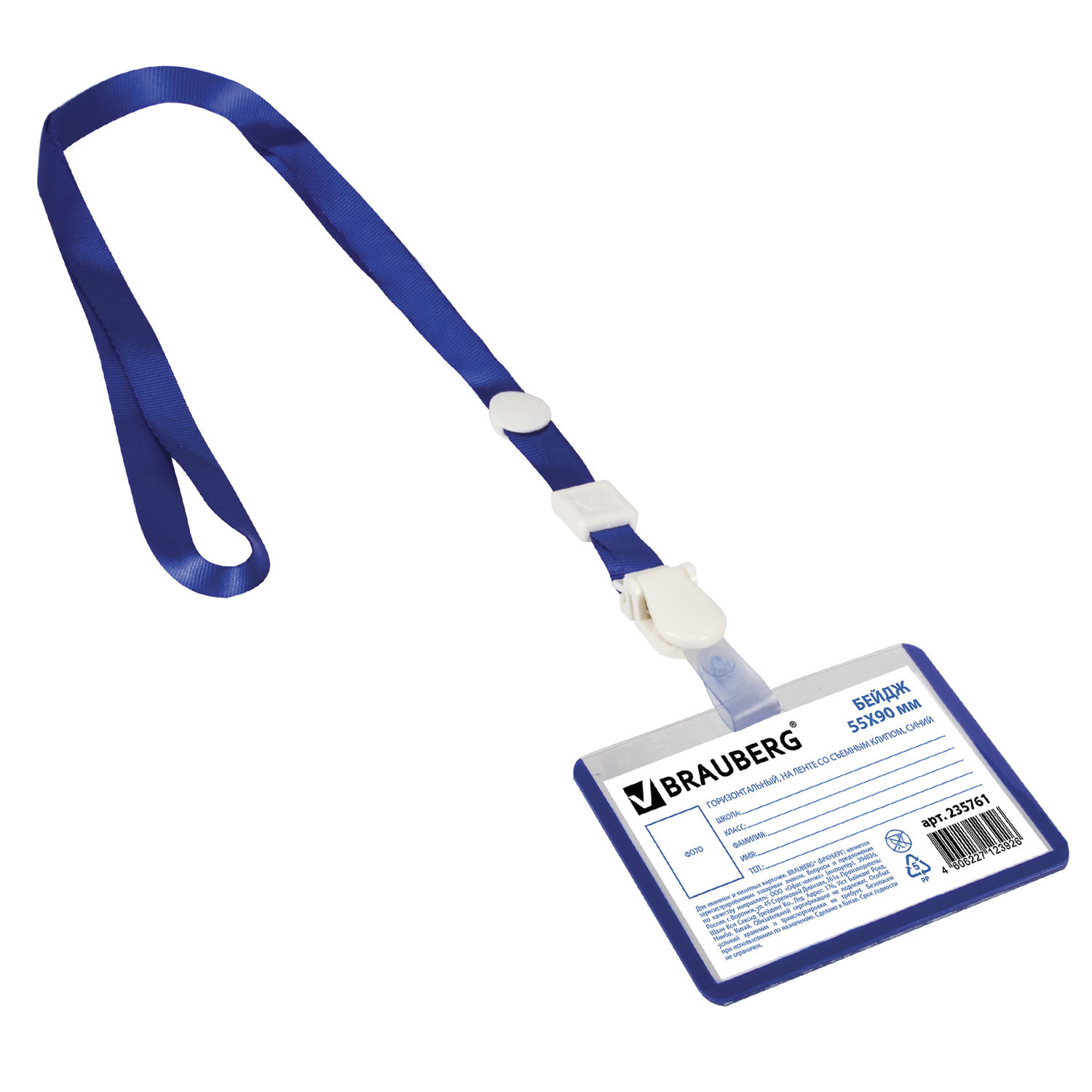 Бэйдж горизонтальный "Brauberg" 55х90мм. сьемный клип на синей ленте арт.235761