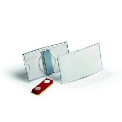 Бeйдж Durablе горизонтального типа изготовлен из выгнутого прозрачного акрила. Предназначен для размещения именной карточки. В изделии в качестве крепежного элемента используется двойной магнитный зажим. Поставляется в упаковке в количестве 25 шт. Размер бейджа — 40×75мм.