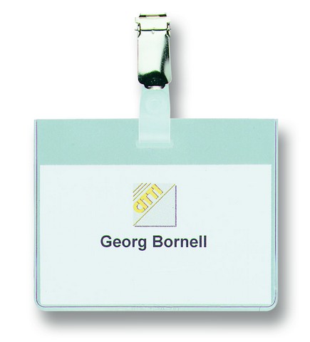 Горизонтальные бейджи Durable с металлической клипсой имеют размер 90×60 мм, предназначены для ношения именной карточки. Изготовлены из твердой прозрачной пленки. Поставляются упаковками по 5 штук.