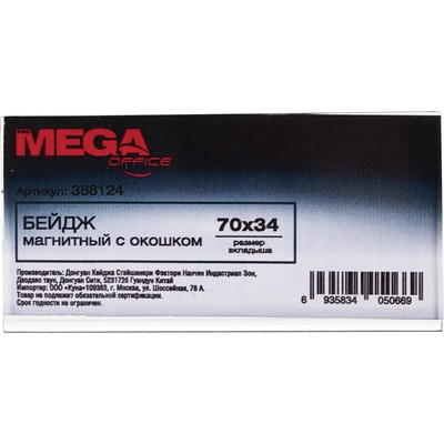 Бейдж магнитный с окошком 70х34 изготовлен из прозрачного пластика. В изделии в качестве крепежного элемента используется магнит.Для удобного и надежного крепления на одежде из деликатных тканей. Страна производитель:Китай.