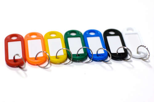 Бирки для ключей представляют собой цветной пластиковый корпус с бумажной вставкой и колечком для крепления ключа.
