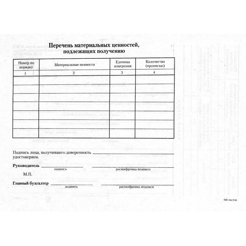 Бухгалтерские бланки — доверенность, типовая форма М-2. Удостоверяют право сотрудника организации получать материальные ценности по договору, заказу, наряду, соглашению, счету. Бланки отпечатаны на офсетной бумаге формата А5, склеены по 100 штук в виде книжки. В комплекте 5 книжек, упакованных в термоусадочную пленку.