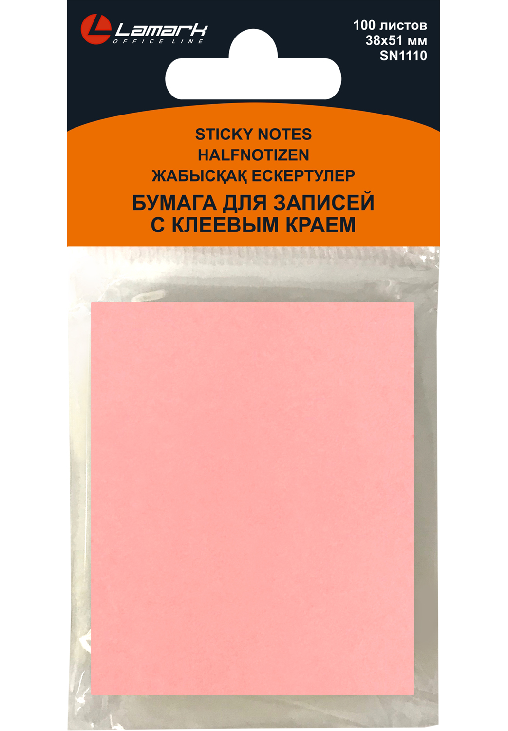 Бумага для заметок Lamark с клеевым краем, цвет розовый пастельный, 100 листов в блоке, размер 38x51 мм. Листы надежно крепятся на любые поверхности и при удалении не оставляют следов. Поставляется в индивидуальном пакете с лип.клапаном, с еврослотом.