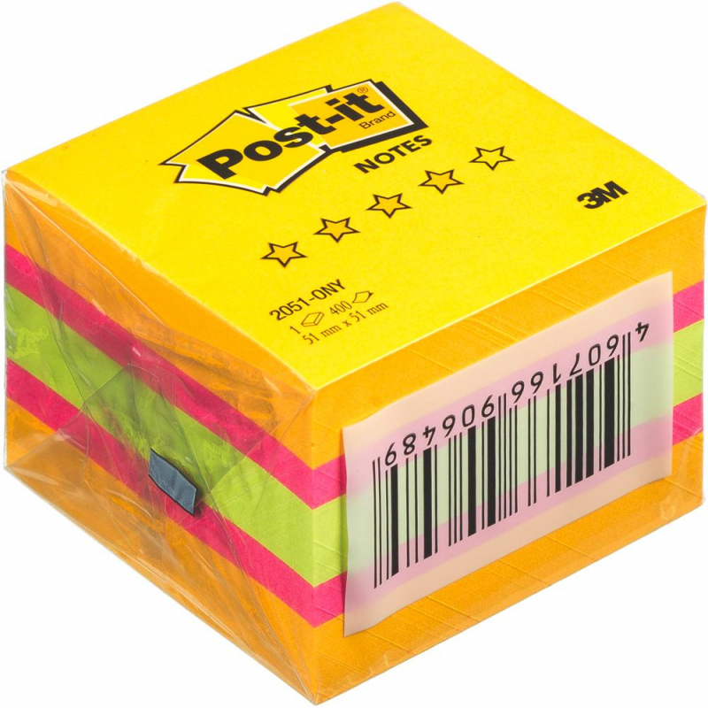 Стикеры из 3 неоновых цветов (желтый, розовый, салатовый). Формат 51x51 мм, блоке 400 листов. Стикеры упакованы в пленку.