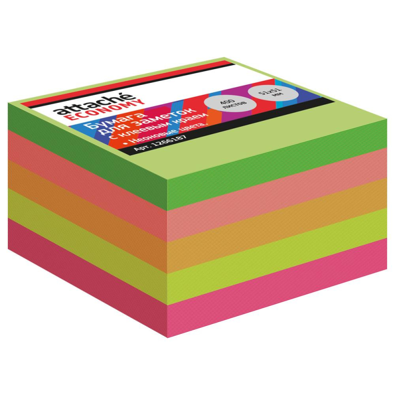 Стикеры Attache Economy в формате 51x51 мм, состоят из 400 листов упакованных в пленку. Стикеры имеют 5 слоев из 5 неоновых цветов (пурпурный, желтый, оранжевый, розовый, зеленый). Плотность бумаги: 75 г/кв.м. Клейкий слой - 16 Н/м. Длина клейкой стороны 51 мм.