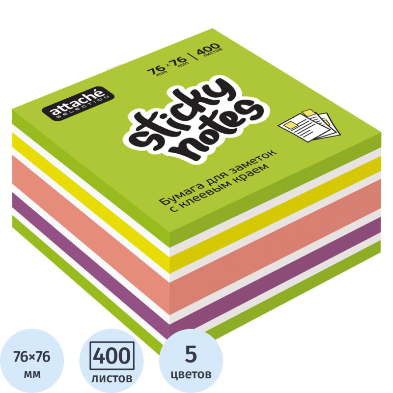 Стикеры Attache Selection Фреш в формате 76x76 мм, состоят из 400 листов упакованных в пленку. 5 неоновых и пастельных цветов (неоновый зеленый, неоновый желтый, неоновый фиолетовый, пастельный розовый, белый). Плотность бумаги: 75 г/кв.м. Клейкий слой - 22 Н/м. Идеально подойдут для сотрудников творческих профессий и руководителей: рекомендуются для использования в процессе совещаний, обучения, мозговых штурмов. Длина клейкой стороны - 76 мм. Особых условий хранения не требует, сертификации не подлежит, срок годности не ограничен. Чтобы увеличить срок службы стикеров, пожалуйста, следуйте рекомендациям: 1) Отделять стикер от блока следует вдоль клеевой полосы. Так можно избежать скручивания и последующего отклеивания стикера. 2) Прежде чем наклеивать стикер, убедитесь в отсутствии грязи и пыли на поверхности. На чистой поверхности срок службы клеевого слоя более продолжителен.
