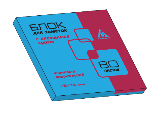 Тип: Самоклеящийся блокПрименение: Для записей и заметокРазмеры: 76 х 76 ммЦвет: Голубой неонКоличество: 80 листов