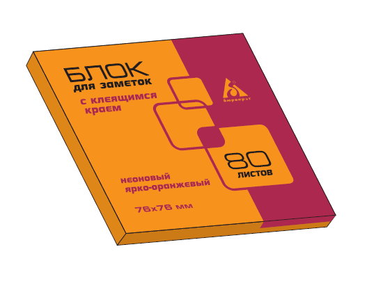 Тип: Самоклеящийся блокПрименение: Для записей и заметокРазмеры: 76 х 76 ммЦвет: Оранжевый неонКоличество: 80 листов