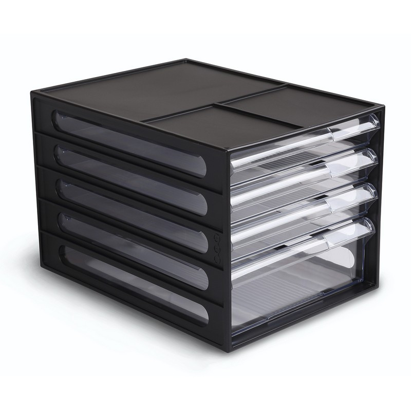 Бокс с 4-мя выдвижными лотками для документов формата А4 и канцелярских мелочей. Изготовлен из полистирола. Устойчивый, прочный корпус гарантирует сохранность содержимого, ограничитель, имеющийся на лотках, препятствует выпадению даже самых мелких предметов. На каждом лотке есть место для подписи, что облегчает сортировку. Размер - 340x250x225 мм. Вес: 1,733 кг. Цвет корпуса - черный, цвет лотков - прозрачный.