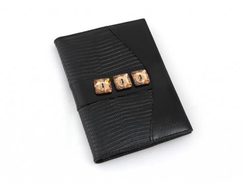 Кожаный бумажник водителя "Elisir", коллекция "Bergamo black". На лицевой стороне сочетание кожи "рептилия" и гладкой чёрной кожи. Бумажник стандартного размера, из натуральной кожи, с композицией из трёх пришивных кристаллов Swarovski. Внутри 4 кармана для кредиток, 2 открытых кармана из кожи на передней стенке и 2 -на задней. Пластиковый блок с отделением для водительских прав, большим отделением для страховки и четырьмя небольшими отделениями (для паспорта транспортного средства и других документов). Упакован в подарочную коробку с тиснением "Elisir". Размеры, мм (XxYxZ): 107х138х1