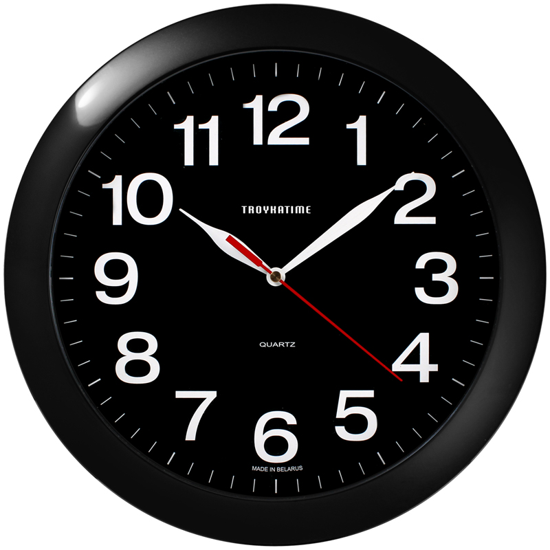 Часы настенные Troyka 11100196. Материал корпуса - пластик. Циферблат закрыт прочным пластиком. Механизм c плавным ходом. Диаметр - 290 мм. Часы работают от 1 элемента питания типа АА.