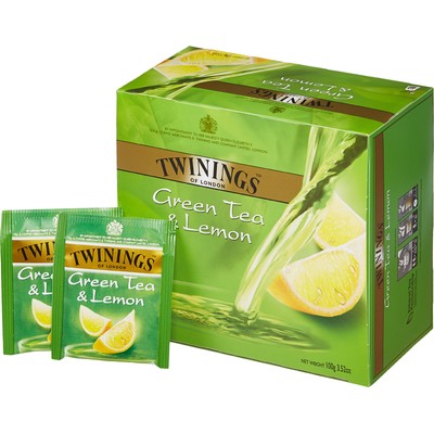 Twinings Green tea & Lemon — зеленый чай с кусочками лимона. Естественные смеси зеленого чая утолят жажду и придадут бодрость в любое время года. В упаковке 50 пакетиков чая. Вес 100 г.