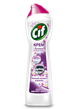 Крем Cif Aroma Нежный жасмин и фиалка содержит особые частицы порошка и удаляющие жир компоненты, благодаря чему он эффективно справляется со сложными и трудновыводимыми загрязнениями во всем доме, гарантируя сияющий результат без повреждения поверхностей.