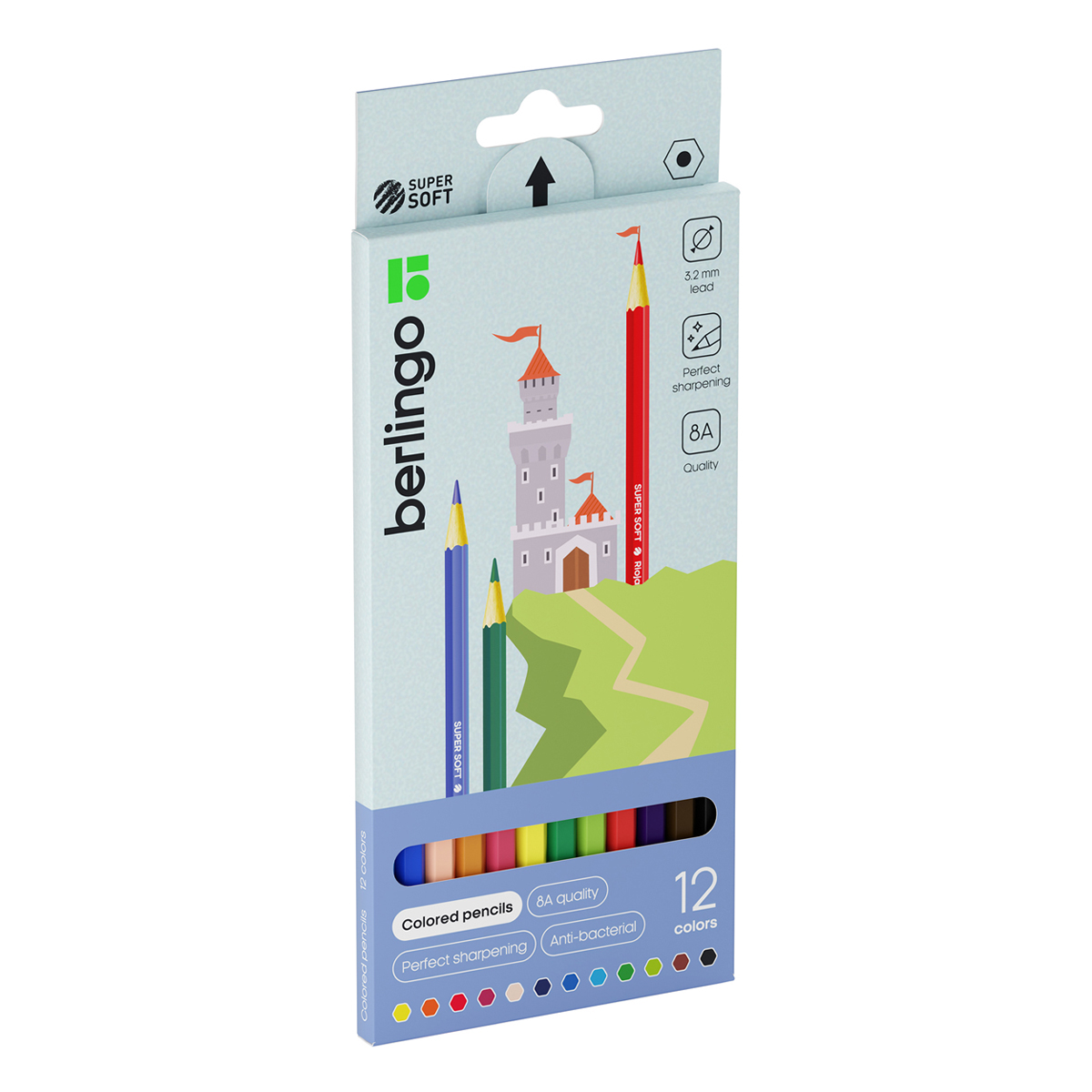 "SuperSoft" - линейка качественно новых цветных карандашей Berlingo. 12 цветов. Шестигранная форма. Указание цвета на каждом карандаше на английском языке. Поле для подписи имени владельца на каждом карандаше. Упаковка в плотную матовую картонную коробку со склеенным европодвесом.