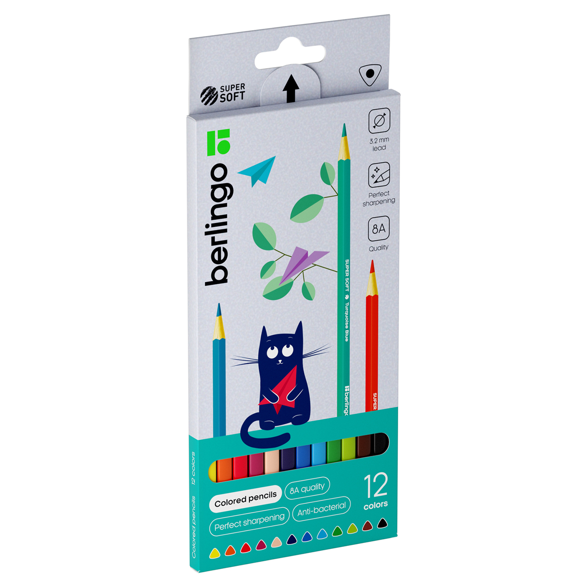SuperSoft" - линейка качественно новых цветных карандашей Berlingo. 12 цветов. Эргономичная трехгранная форма. Указание цвета на каждом карандаше на английском языке. Поле для подписи имени владельца на каждом карандаше. Упаковка в плотную матовую картонную коробку со склеенным европодвесом.
