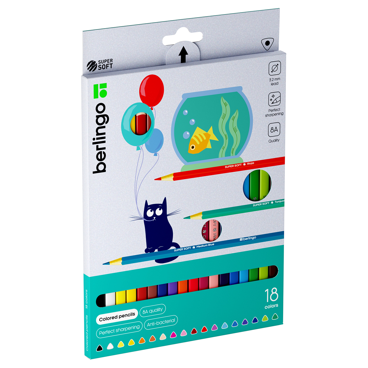"SuperSoft" - линейка качественно новых цветных карандашей Berlingo. 18 цветов. Эргономичная трехгранная форма. Указание цвета на каждом карандаше на английском языке. Поле для подписи имени владельца на каждом карандаше. Упаковка в плотную матовую картонную коробку со склеенным европодвесом. Пластиковый трей внутри предотвращает скатывание карандашей и позволяет легко собирать их в коробку.