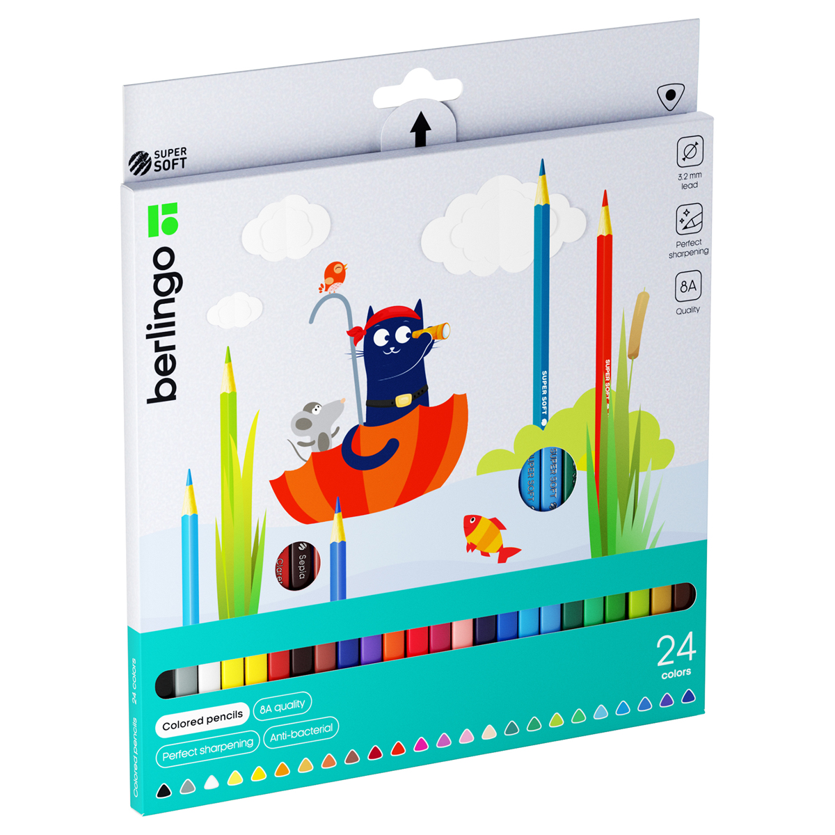 "SuperSoft" - линейка качественно новых цветных карандашей Berlingo. 24 цвета. Эргономичная трехгранная форма. Указание цвета на каждом карандаше на английском языке. Поле для подписи имени владельца на каждом карандаше. Упаковка в плотную матовую картонную коробку со склеенным европодвесом. Пластиковый трей внутри предотвращает скатывание карандашей и позволяет легко собирать их в коробку.