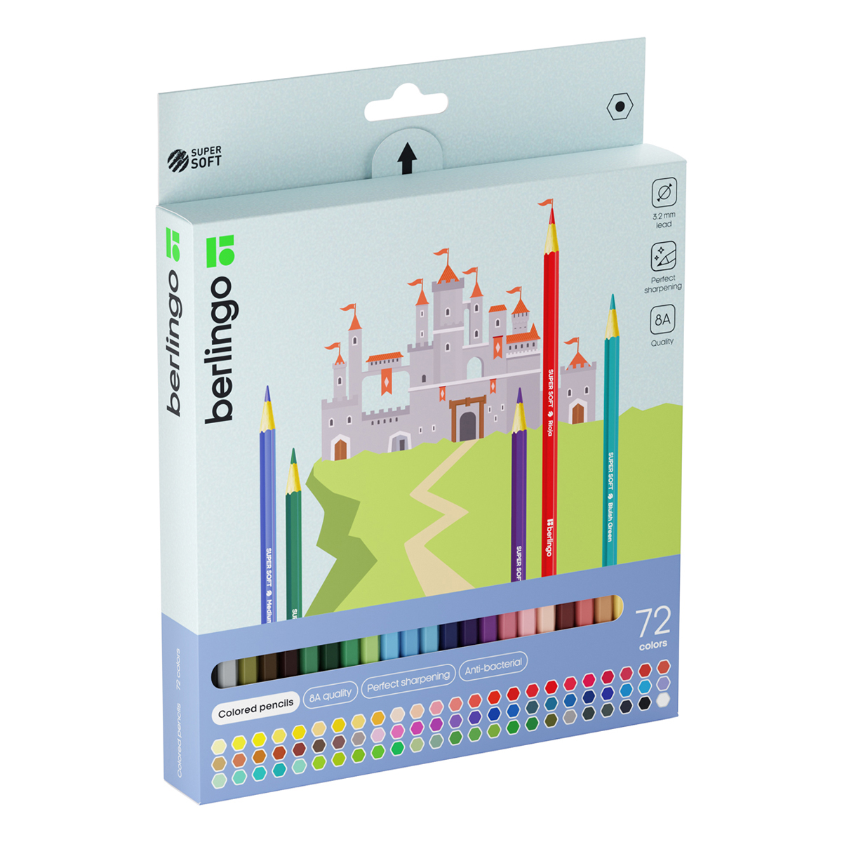 "SuperSoft" - линейка качественно новых цветных карандашей Berlingo. 72 цвета. Шестигранная форма. Указание цвета на каждом карандаше на английском языке. Поле для подписи имени владельца на каждом карандаше. Упаковка в плотную матовую картонную коробку со склеенным европодвесом.