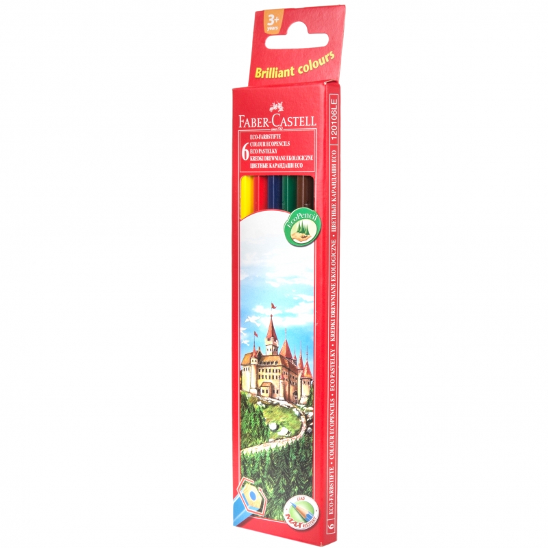 Набор из шести цветных карандашей 'ECO Замок'. Карандаши изготовлены из качественных и натуральных материалов, безопасных для детского здоровья. Шестиугольный корпус из натуральной древесины обеспечивает удобный захват. Специальная технология позволяет предотвратить крошение и поломку грифеля. Легко затачиваются любым видом точилки.