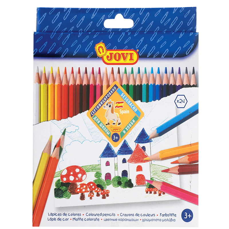 Шестигранные деревянные карандаши толщиной 7,5 мм, длиной 175 мм. Цветные карандаши в деревянном корпусе. Грифель приклеен к деревянному корпусу, что предохраняет его от поломок при падении. Рисуют на бумаге, ватмане, картоне. Расширенная палитра из 24 красивых чистых цветов (белый, лимонный, желтый, темно-желтый, светло-оранжевый, оранжевый, розовый, малиновый, рубиновый, красный, бордовый, лиловый, светло-зеленый, зеленый, темно-зеленый, бирюзовый, голубой, синий, темно-синий, сапфировый, светло-коричневый, коричневый, серый, черный).