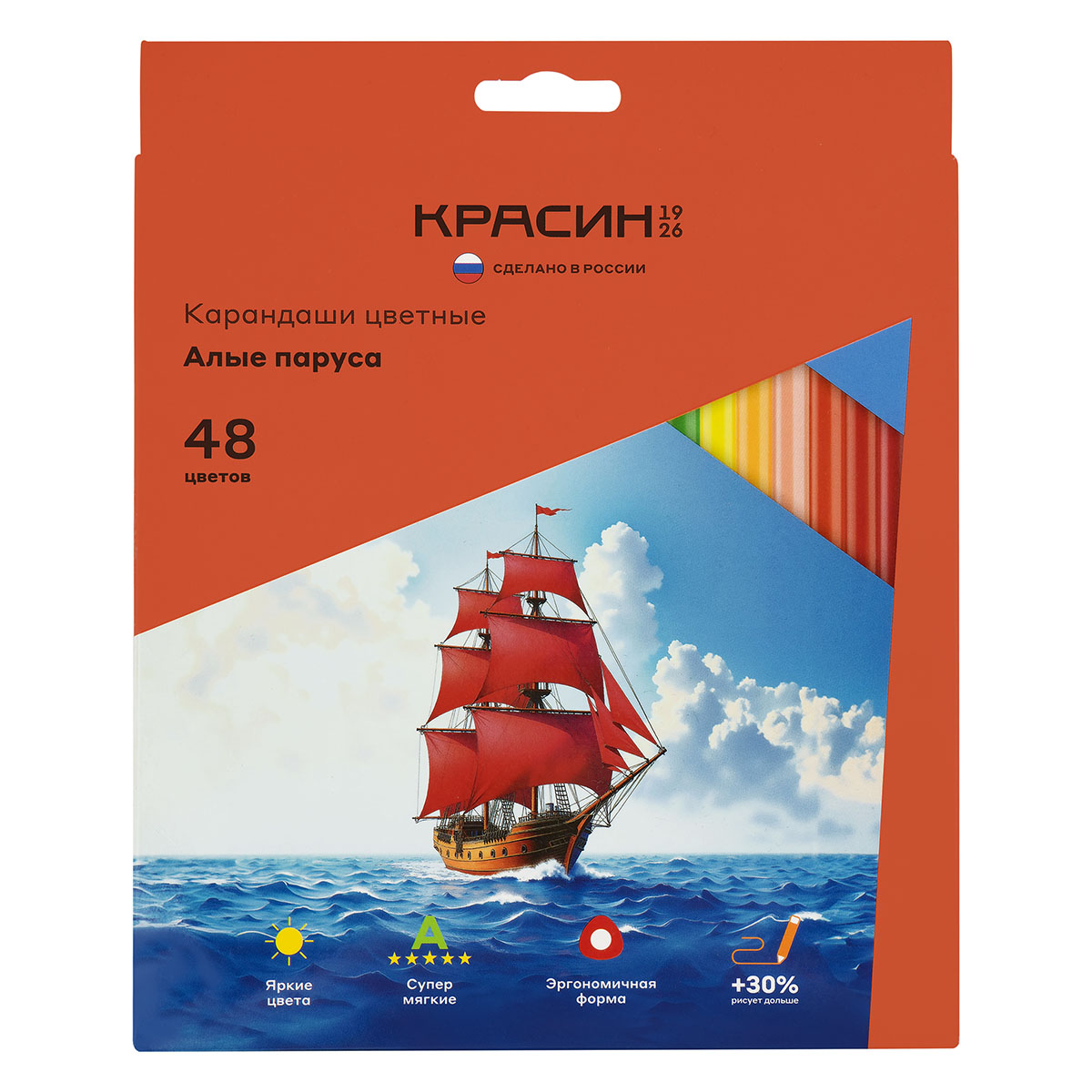 Набор цветных карандашей «Красин» серии «Алые паруса» — отличный помощник на уроках рисования и прекрасный инструмент для детского творчества. В наборе 48 цветов. Корпус карандашей эргономичной трёхгранной формы изготовлен из натуральной древесины липы. При производстве используется специальная технология склейки, которая увеличивает прочность и надёжность заклейки стержня в карандаше, предохраняет его от повреждений при падении.