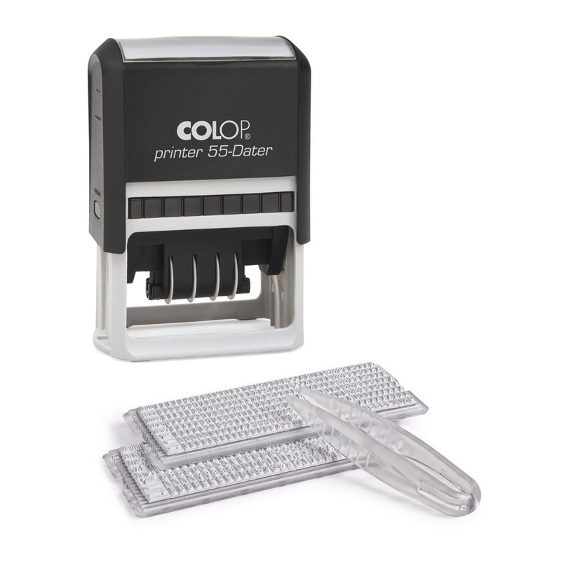 В комплекте: датер с рифленой пластиной, касса букв, пинцет, двухцветная сменная подушка E/55 (арт. 3256)