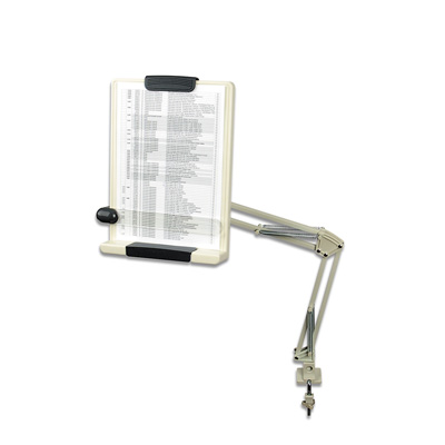 Держатель бумаг формата А4. Регулировка положения и угла наклона держателя. Подвижная и прозрачная линейка. Крепление к столу при помощи струбцины. Вращается на 360 градусов.