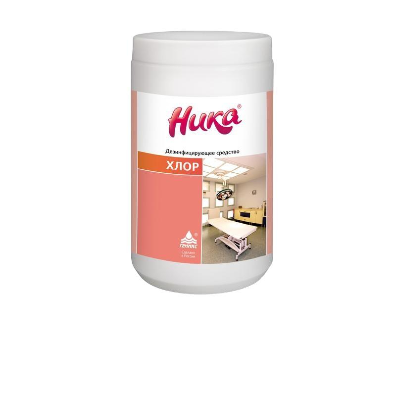 Дезинфицирующее средство Ника Хлор 1 кг (300 таблеток)Средство ?Ника-Хлор? обладает антимикробным действием в отношении грамотрицательных и грамположительных бактерий (включая микобактерии туберкулеза), вирусов (включая аденовирусы, вирусы гриппа, парагриппа и др. возбудителей острых респираторных инфекций, энтеровирусы, ротавирусы, вирус полиомиелита, вирусы энтеральных, парентеральных гепатитов, герпеса, атипичной пневмонии, птичьего гриппа, свиного гриппа, ВИЧ и др.) и грибов рода Кандида и дерматофитов.Назначение: средство ?Ника-Хлор? применяют для дезинфекции в виде рабочих растворов средства и в форме таблеток и гранул.Состав и характеристики:- натриевая соль дихлоризоциануровой кислоты (Nа-соль ДХИЦК) в количестве 84%;- активный хлор в таблетках и гранулах 45,5%;- выпускается форме таблеток весом 3,32 г, выделяющих при растворении 1,52 г активного хлора.Область применения:- в виде растворов, приготовленных из таблеток и гранул- для дезинфекции поверхностей в помещениях, жесткой мебели, санитарно-технического оборудования, белья, посуды (в т. ч. одноразовой и лабораторной), предметов для мытья посуды, игрушек, предметов ухода за больными, средств личной гигиены, резиновых и полипропиленовых ковриков, обуви из резиновых и полимерных материалов, уборочного инвентаря и материала при проведении текущей, заключительной и профилактической дезинфекции в медицинских учреждениях 1, инфекционных очагах, в детских и образовательных учреждениях, на коммунально-бытовых объектах (гостиницы, общежития, бани, прачечные, парикмахерские, промышленные рынки, общественные туалеты и др.), на предприятиях общественного питания и торговли, культурно-оздоровительных и спортивных комплексах, учреждениях социального обеспечения, пенитенциарных учреждениях;- для проведения генеральных уборок в медицинских и детских учреждениях, инфекционных очагах, на санитарном транспорте и транспорте для перевозки пищевых продуктов и продовольственного сырья, в пенитенциарных учреждениях, в учреждениях социальной и коммунально-бытовой сферы;- для дезинфекции изделий медицинского назначения из коррозионно-стойких металлов, резин, пластмасс, стекла;- для дезинфекции медицинских отходов (в том числе изделий медицинского назначения однократного применения, перевязочного материала, одноразового постельного и нательного белья, одежды персонала) перед их утилизацией;- для обеззараживания специального оборудования, спецодежды и инструмента парикмахерских, массажных салонов, бань, саун, клубов, салонов красоты, прачечных, санпропускников и других объектов сферы обслуживания населения;- для дезинфекции биовыделений (кроме мочи): мокроты, фекалий, фекально-мочевой взвеси, рвотных масс, остатков пищи, крови, ликвора, сыворотки и др.Срок хранения: в невскрытой упаковке производителя - 3 года.Срок годности рабочих растворов средства - не более 6 суток.