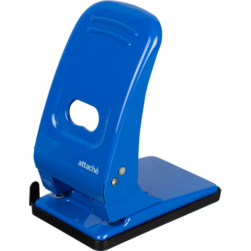Дырокол Attache Economy работает с документами толщиной до 60 листов плотностью 80 г/кв.м. Пробивает два отверстия диаметром 6 мм, расстояние между отверстиями - 80 мм. Наличие линейки A3, A4, A5, A6, B4, B5, B6 позволяет зафиксировать бумагу на нужном расстоянии, отметка на линейке 888 позволяет использовать вместо дырокола на 4 отверстия. Удобный контейнер легко открывается и закрывается, исключая рассыпание конфетти. Оснащен фиксатором для компактного хранения дырокола. Дырокол выполнен в металлическом корпусе синего цвета. Для разблокировки дырокола надо плавно надавить на рычаг. Фиксатор, находящийся под рычагом, выйдет из паза, расположенного в стойке со стороны линейки, и даст возможность рычагу подняться. Чтобы заблокировать дырокол, необходимо опустить рычаг, зафиксировать его в горизонтальном положении и направить фиксатор в паз