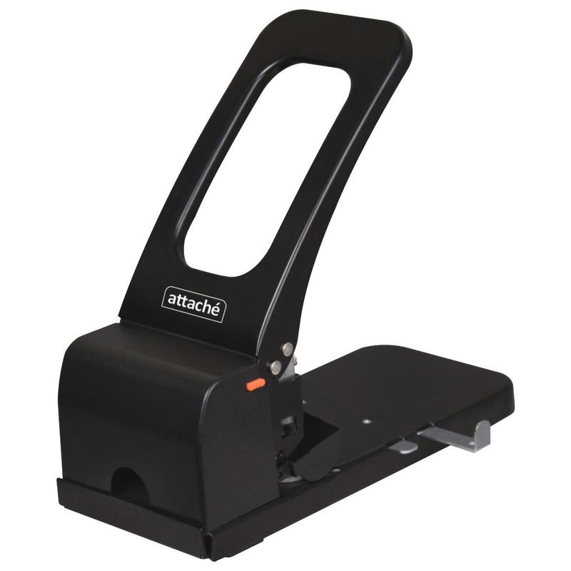 Мощный дырокол Attache пробивает одновременно до 100 листов (70 гр/м2) и 85 листов стандартной 80 гр/м2 плотности бумаги. Перфорирует два отверстия диаметром 6 мм, расстояние между отверстиями — 80 мм. В дыроколе предусмотрен отсек для конфетти и выдвижная ограничительная линейка, что позволяет зафиксировать бумагу. Выполнен в металлическом корпусе черного цвета с противоскользящим основанием. Диски закреплены под ножами, они крутятся, чтобы была возможность прокрутить до неиспользованной части диска, когда от использования поверхность под ножом изнашивается и качество пробивания ухудшается. Оснащен фиксатором для компактного хранения дырокола.