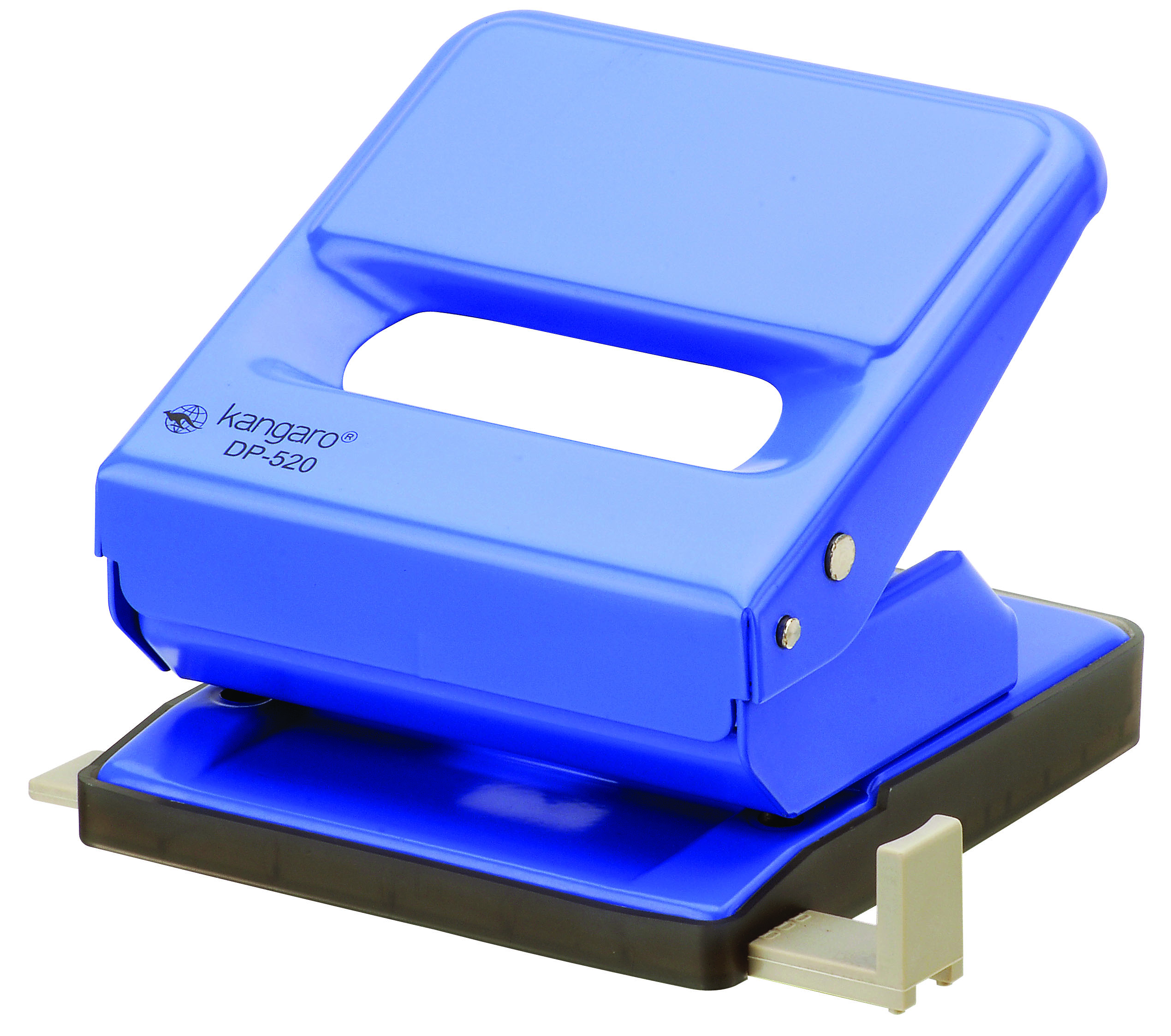Дырокол настольный, расстояние между ножами – 80 мм, имеется пластиковый форматир, наружный диаметр ножа – 5,5мм. Пробивает: 25 листов. Цвет - синий. Изготовлен целиком из металла, со съемным пластиковым контейнером, предохраняющим поверхность стола от царапин.