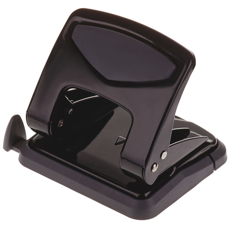 Металлический дырокол, пробивная мощность 35 листов. Дырокол снабжен ограничительной форматной линейкой, фиксатором и антискользящей вставкой. Цвет корпуса черный.