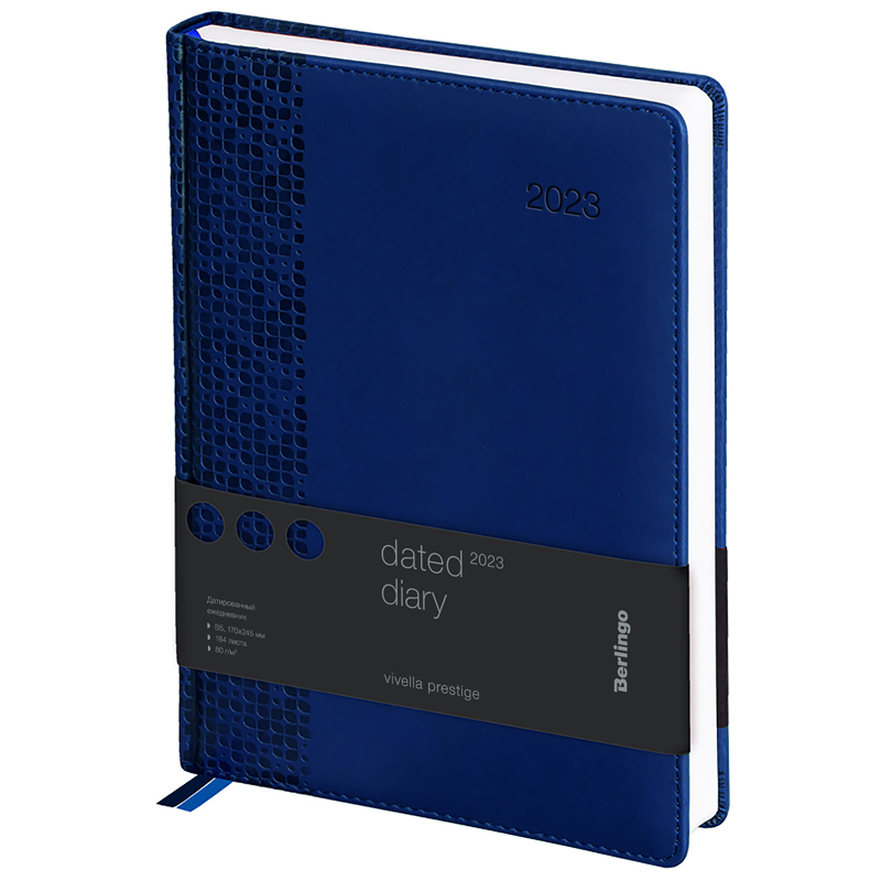 Стильный датированный ежедневник на 2023 год Berlingo Vivella Prestige формата В5 (170*215 мм) с классической твёрдой матовой обложкой из высококачественной экокожи синего цвета. Имиджевое тиснение на обложке добавляет интересную деталь в насыщенной цвет обложки.