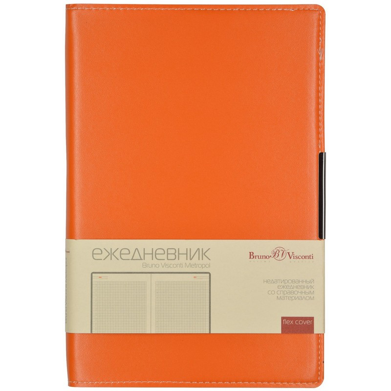 Ежедневник недатированный Bruno Visconti, цвет оранжевый. Коллекция Metropol. Формата А5, размер изделия - 143x216 мм. Функциональный ежедневник обладает запоминающимся дизайном: гибкая обложка из высококачественного переплетного материала по периметру подчеркнута контрастной строчкой белыми нитками, ляссе в цвет обложки. Стиль и функциональность - качества, наиболее ценимые в современном мире. Этим качествам полностью соответствует серия Metropol - высококачественный материал обложки, модный форм-фактор, стильный металлический шильдик, сменный блок делают ежедневники и еженедельники этой серии прекрасным компаньоном современного городского профессионала. Возможно нанесение тиснения (гравировка,блинт,фольга, шелкография, УФ-печать). Блок: недатированный, 136 листов (272 страницы), сделанных из бежевой бумаги плотностью 70 г/кв.м, в клетку. На 18 первых страницах размещена справочная информация с ценными сведениями из разных областей: часовые пояса, аэропорты Европы, телефонные коды, размеры одежды, формат бумаги.