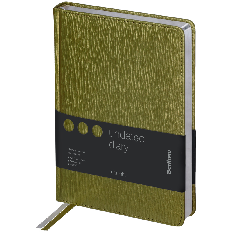 Оригинальный недатированный ежедневник Berlingo Starlight формата А5 с твердой блестящей обложкой из экокожи и поролоновой прослойкой идеально подойдет в качестве подарка. Серебряный фольгированный срез красиво подчеркивает нежный салатовый цвет обложки с продольной текстурой. Внутренний блок состоит из 160 листов высококачественной кремовой бумаги повышенной плотности 80 г/м² с пантонной печатью в 2 краски. Размер недатированного ежедневника – 150 на 215 мм.