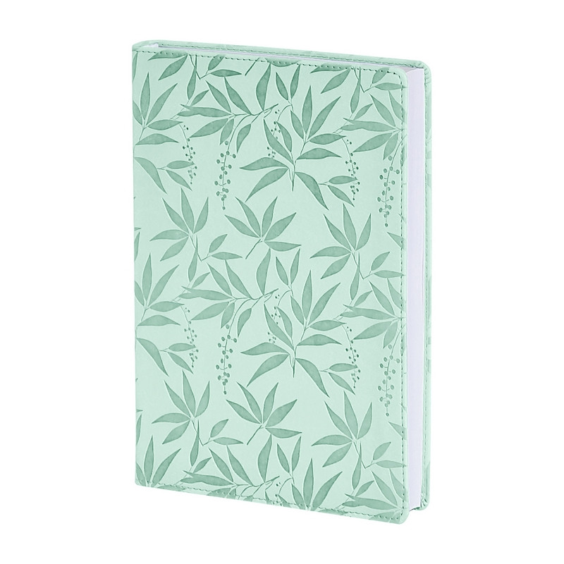 Ежедневник недатированный Infolio из коллекции Leaves А5 формата (140х200 мм) в мятном цвете и с тиснением свежих листочков, которые создают весеннее настроение. Мягкая обложка из матовой гладкой искусственной кожи с декоративным тиснением и прострочкой по периметру имеет скругленные уголки. Недатированный внутренний блок в линейку на 160 листов (320 страниц) - из высококачественной белой бумаги плотностью 70 г/кв.м с прямыми уголками. В ежедневнике имеется информационный блок, содержащий разделы: личные данные, карты мира и России, российские праздники, разница во времени между Москвой и городами России, международные единицы мер, планирование задач, важные даты. В ежедневнике также имеется одна удобная атласная закладка.