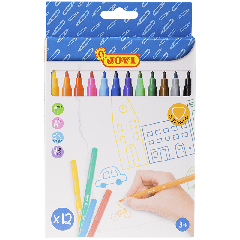 Фломастеры представлены с коническим наконечником. Пластиковый корпус трехгранной формы с треугольной формой захвата, которая тренирует навык правильного захвата и снижает нагрузку на кисти рук. Полностью безопасные чернила на водной основе с пищевыми красителями. Фломастеры не высыхают без колпачка в течение 96 часов. Специальные вентилируемые колпачки обеспечивают прохождение воздуха при случайном проглатывании. Фломастеры JOVI легко смываются с кожи и отстирываются с большинства видов тканей. Упакованы в картонную коробку с европодвесом.