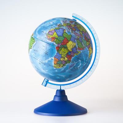 Политический глобус диаметром 21 см выполнен из прочного пластика. Дает представление о политическом устройстве мира, подходит как в качестве учебного пособия, так и для дома. На глобус нанесены границы государств и демаркационные линии, столицы и крупные города, линии перемены дат, железнодорожные и морские пути.