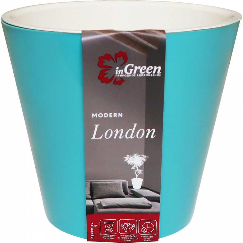 Горшок London состоит из цветного кашпо и внутреннего горшка. Растение высаживается во внутренний горшок с дренажными отверстиями и вставляется в кашпо. Инновационная система автополива обладает рядом преимуществ: экономит время при уходе за растением, вода не протекает при поливе и нет необходимости в подставке, корни не застаиваются в воде. Также корни обеспечены циркуляцией воздуха за счет дренажных отверстий.
