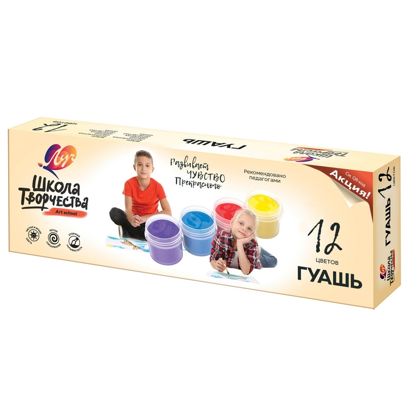 Гуашь "Школа творчества" от ТМ "Луч" изготовлена по улучшенной рецептуре. Яркие и красивые цвета красок стали максимально подготовлены для быстрого рисования. Благодаря меньшему расходованию белил из набора, цвета красок теперь будут заканчиваться равномерно, что позволит использовать набор более рационально. В наборе 12 цветов. Объем 1 банки 20 мл. Набор упакован в картонную коробку.