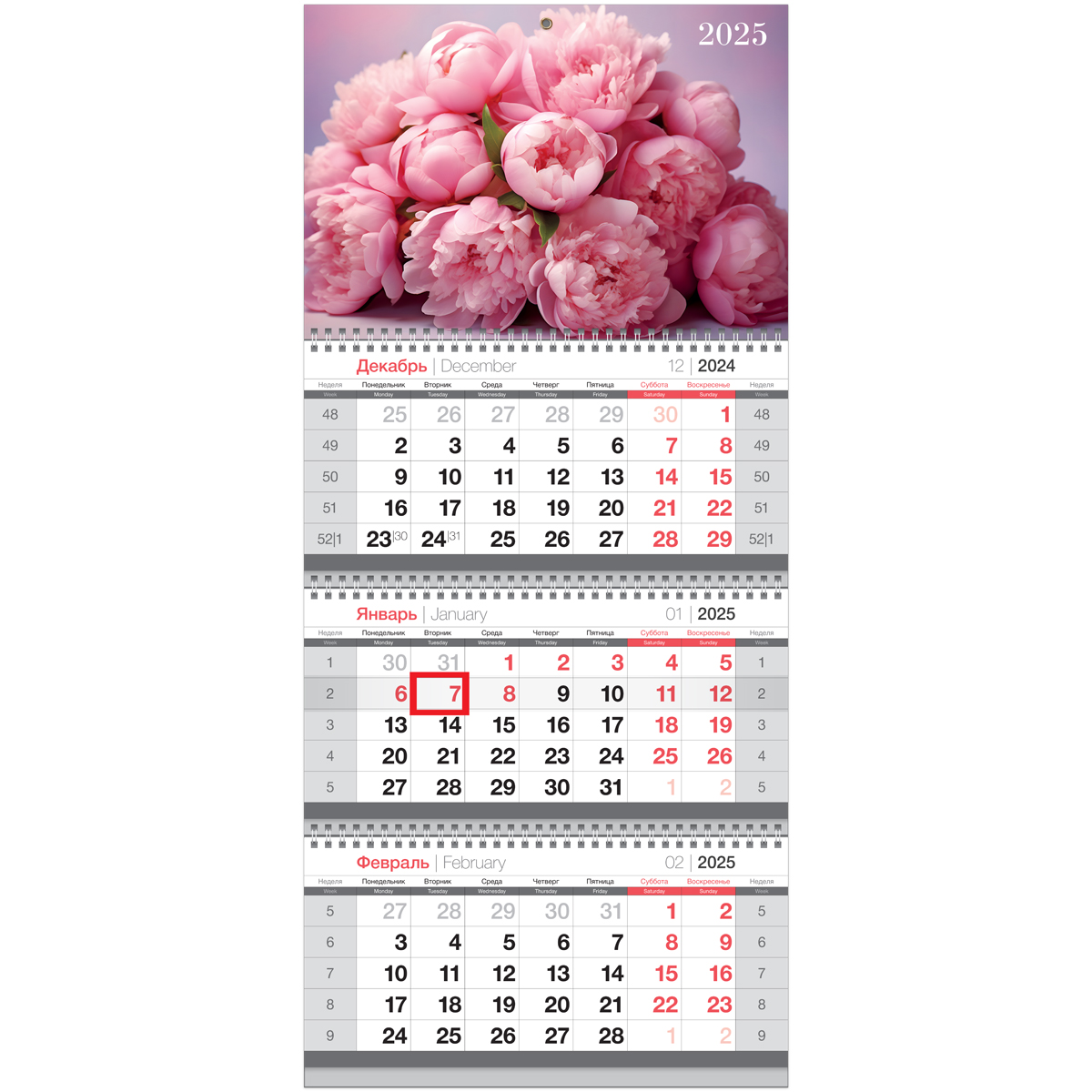 Календарь квартальный BG «Пионы» на 2025 год – незаменимая вещь в жизни делового человека и отличный помощник для офиса. Размер вертикального календаря – 295×660 мм. 3 календарных блока по 12 листов на 3 гребнях изготовлены из офсетной белой бумаги плотностью 65 г/м2 с печатью в 2 краски. Подложка изготовлена из чистоцеллюлозного мелованного картона 320 г/м2. Нижняя имеет цветность в 1 краску, верхняя – полноцветная. Есть удобный бегунок-курсор и пикколо для подвески.