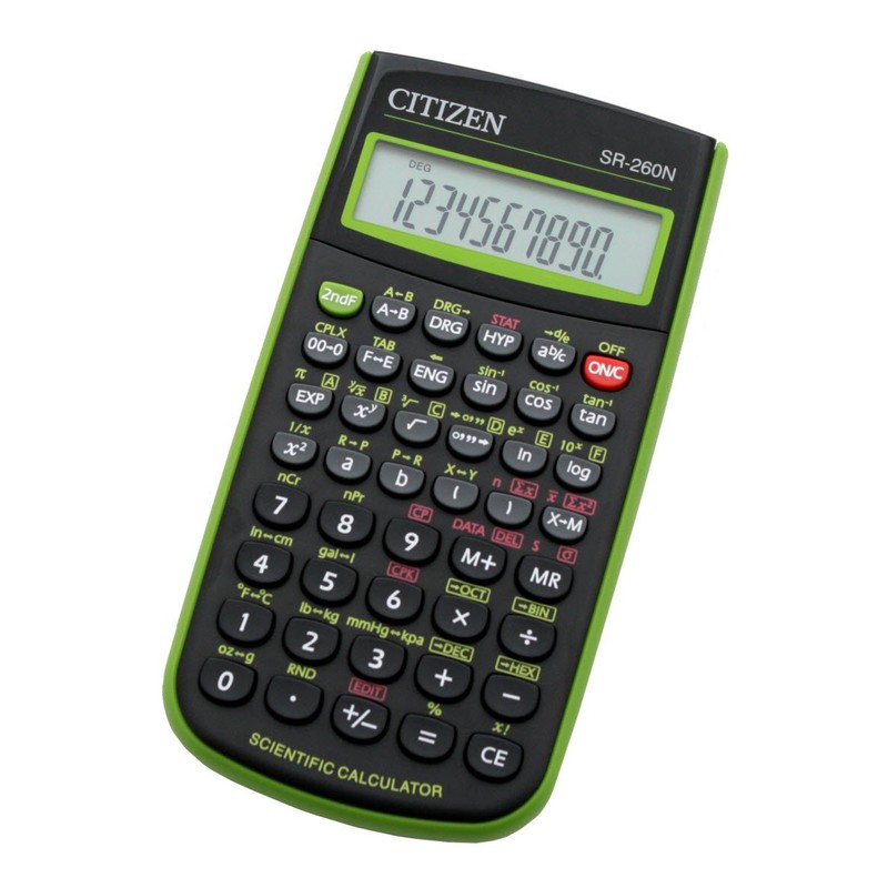Калькулятор Сitizen SR-260NGR, предназначенный для проведения сложных математических расчетов с использованием четырех систем счисления: десятичной, двоичной, восьмеричной и шестнадцатеричной. Модель имеет набор расширенных функций: преобразование координат векторов, действия c обыкновенными дробями, извлечение корней с различными показателями, тригонометрические, логарифмические и статистические вычисления. Пластиковый корпус зеленого цвета оснащен однострочным десятиразрядным ЖК-дисплеем. Питание осуществляется от солнечной батареи.