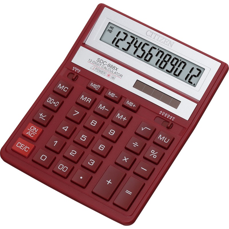 Калькулятор Citizen SDC-888XRD в пластиковом корпусе бордового цвета. Монохромный 12-разрядный дисплей обеспечивает удобство и быстроту вычислений. Калькулятор имеет набор расширенных функций: арифметический расчет, извлечение квадратного корня, вычисление процентов. Модель снабжена клавишей, позволяющей стирать последнее введенное число, кнопками памяти и ввода двойного нуля. Способ округления чисел после запятой регулируется ползунковым переключателем.