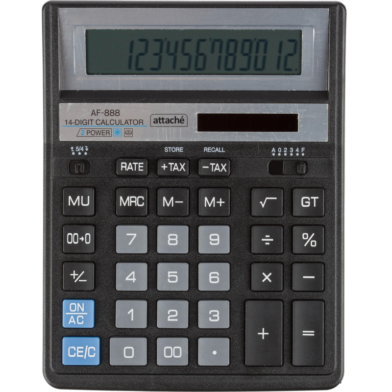 Калькулятор Attache AF-888 настольный в пластиковом корпусе черного цвета с 14-разрядным ЖК-дисплеем. Имеет оптимальный набор вычислительных функций: основные математические операции, расчет процентов, расчет наценки, извлечение квадратного корня, запоминание промежуточных результатов. Калькулятор имеет функцию автоматического отключения питания. Удобная клавиатура снабжена кнопкой ввода двойного нуля. В калькуляторе имеется два источника питания: солнечная батарея и батарейка G10 (не подлежит замене), а так же есть место для установки батареи AA (не входит в комплект). Совместимые батарейки находятся в разделе ?Расходные материалы?. Размер корпуса: 204x158x38 мм. Размер дисплея: 111x24 мм. Материал кнопок клавиатуры: пластик. Перед использованием внимательно ознакомьтесь с инструкцией. Обращаем внимание, что батарейка не входит в комплектацию данного калькулятора.