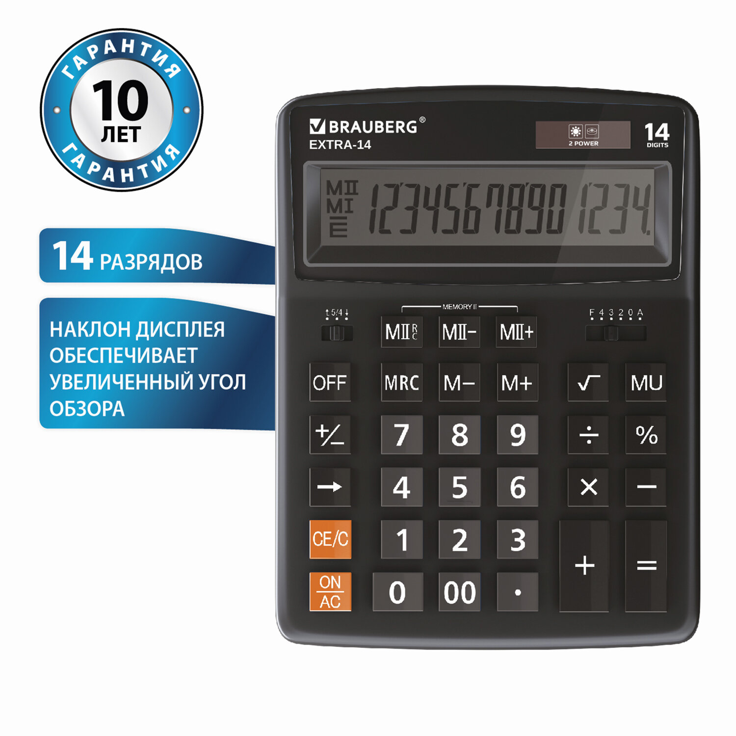Калькулятор настольный BRAUBERG EXTRA-14-BK (206x155 мм), 14 разрядов, двойное питание, ЧЕРНЫЙ