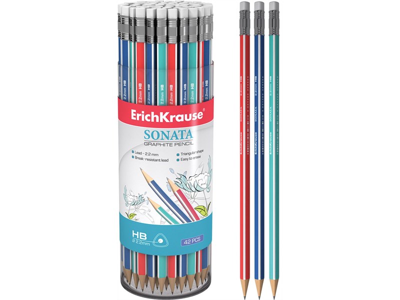Карандаш "Erich Krause" ч/гр Sonata трехгранный с ластиком НВ корпус ассорти арт.ЕК45616